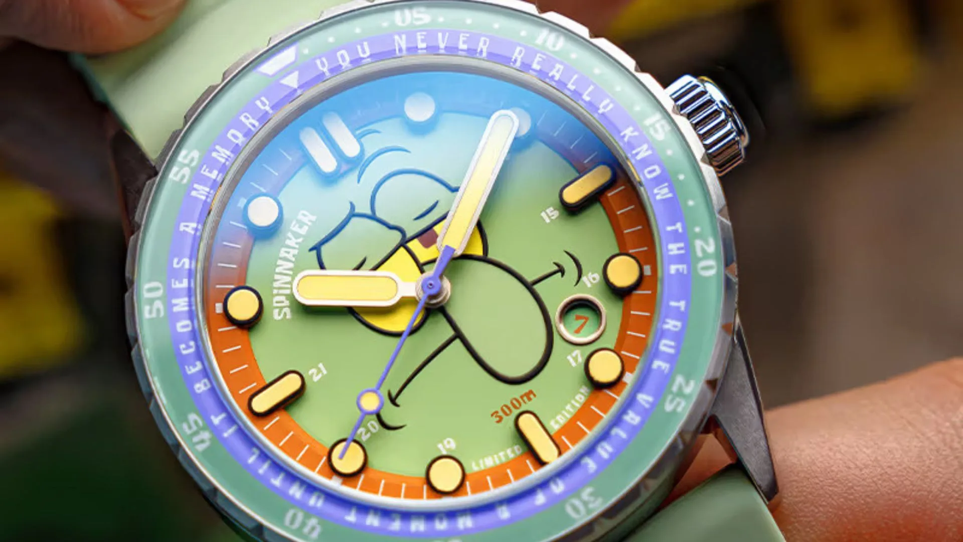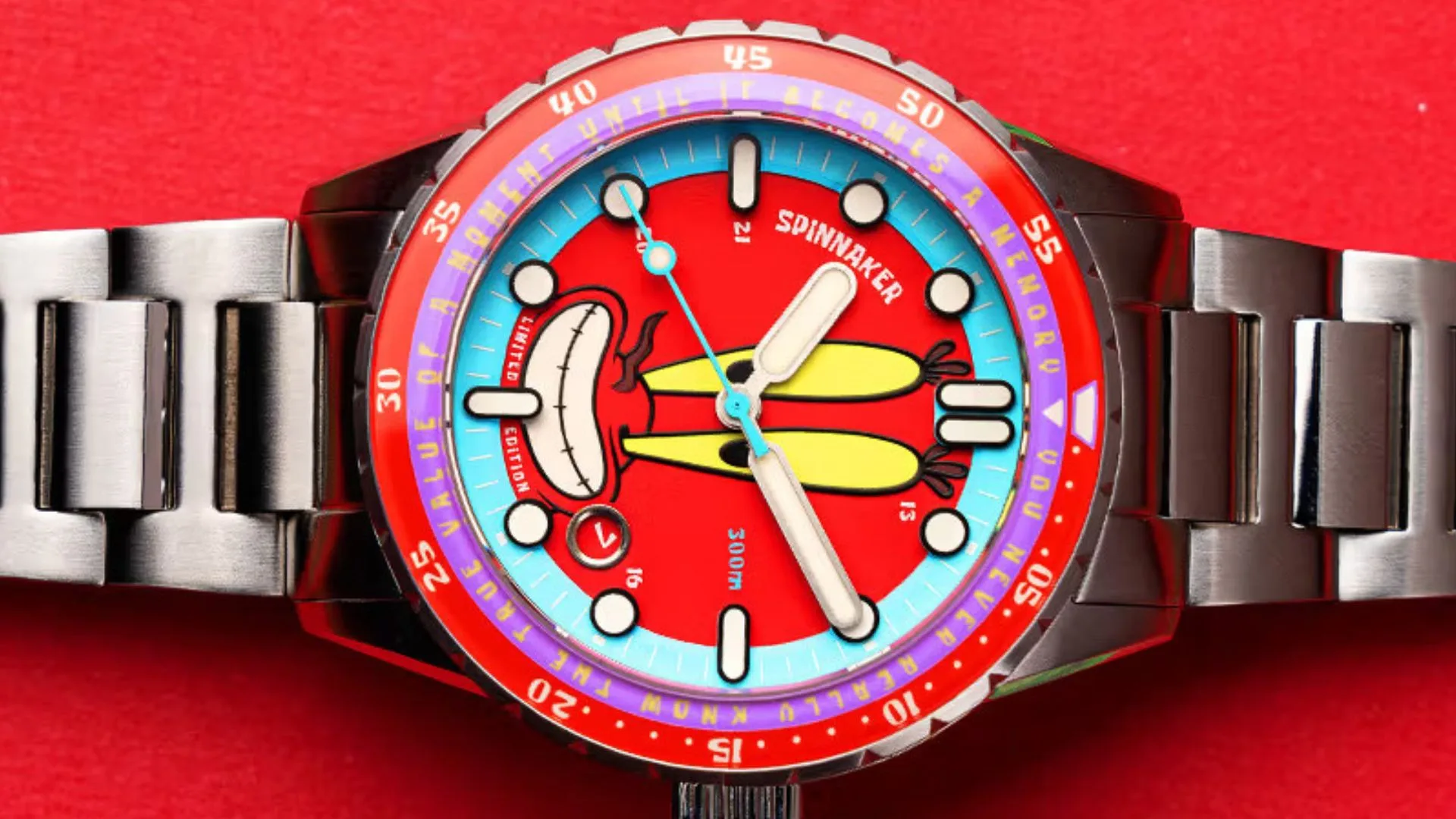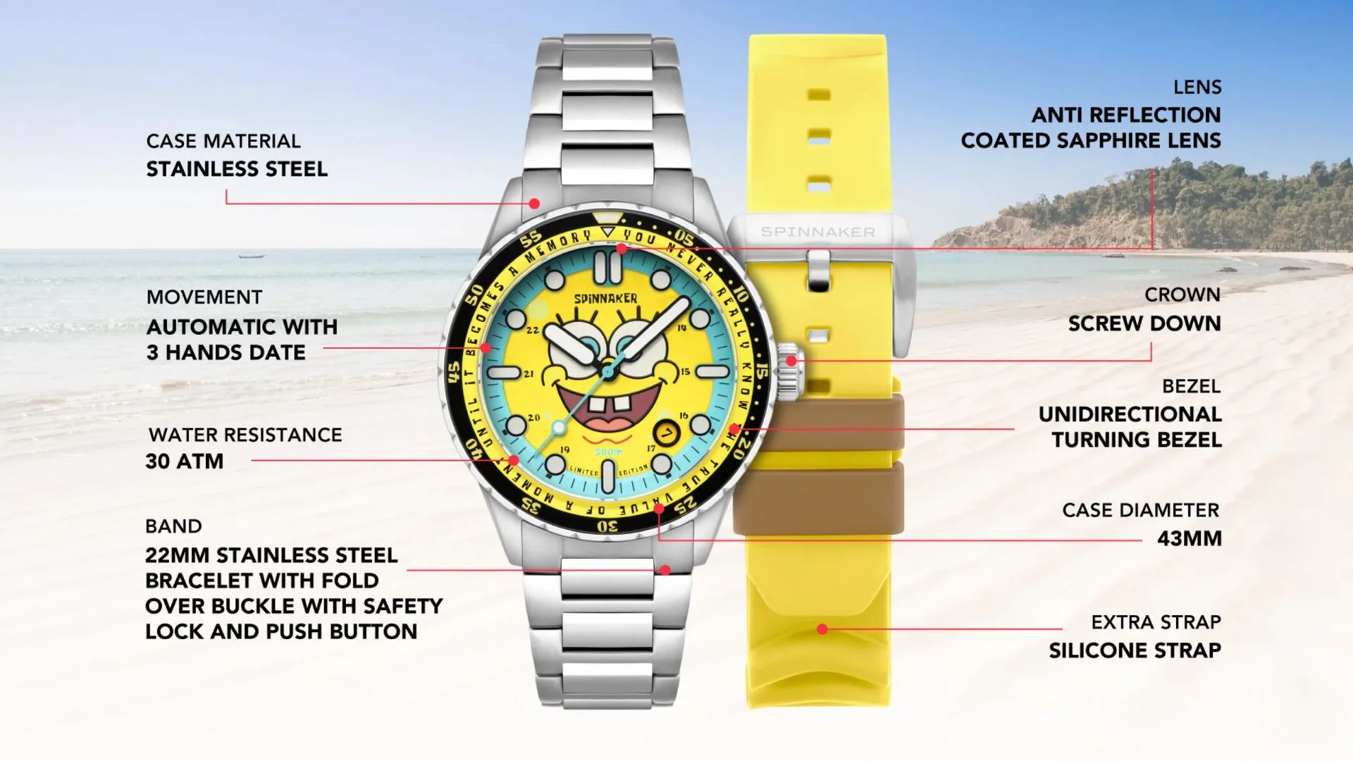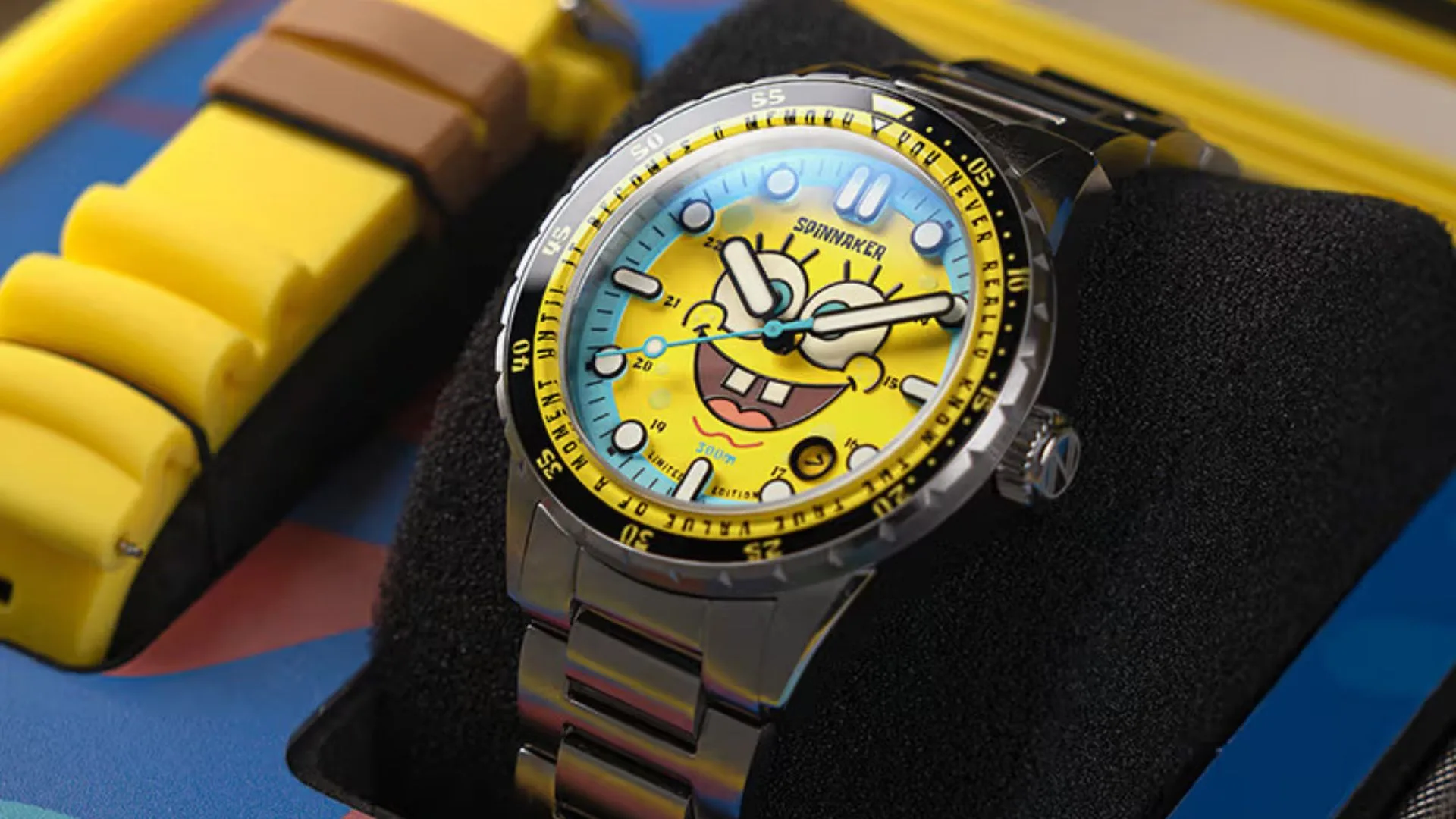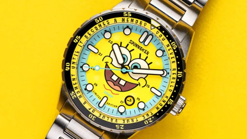 The case width of all models is 43mm, and all versions of the watch have a two-tone unidirectional rotating bezel. The case is made of marine-grade 316L stainless steel and can withstand 30 ATM underwater, which is a fitting specification considering that it was inspired by a nautical cartoon. The steel caseback features the logos of Spinnaker and SpongeBob SquarePants as evidence of their joint venture.
