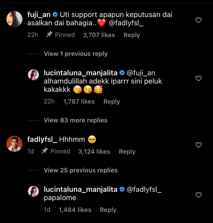 Lucinta’s post even caught the attention of Fadly’s younger sister, Fuji. She commented, “I support whatever your decision is. As long as you are happy @fadlyfsl_”, to which the queer personality replied, “Thank God. Come here and give me a hug, my sister-in-law.” Fadly, on the other hand, briefly responded by writing, “Hhhmm,” with a teary-eyed emoji.