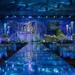 Although the couple had previously teased their friends and family members with a mermaid themed wedding invitation, the actual wedding event was a real feast for the eyes. The interior of the venue was so full of colour, mainly in different shades of blue accompanied with pearl decorations as well as large clam shells and corals.