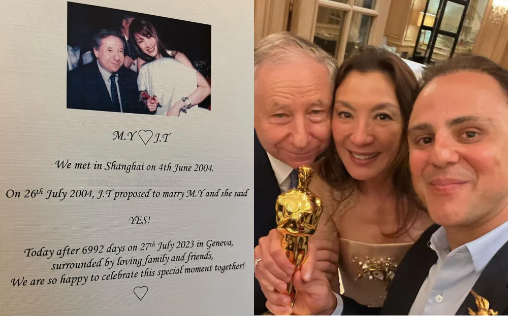 On 28th July, Brazilian F1 driver Felipe Massa uploaded a wedding invitation on his socials, which immediately had fans in a tizzy. The simple card turned out to be an invite to Michelle Yeoh and Jean Todt’s wedding!