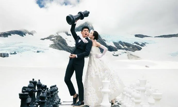 Shot at the Waitomo Glowworm Caves in New Zealand, fashion photographer Liu Zhongyuan did an amazing job with the photoshoot concepts. There were some adorable close-up shots focusing on the couple’s expressions, whimsical snapshots with a stunning backdrop, candid poses, as well as giant chess pieces and snacks being used as props.