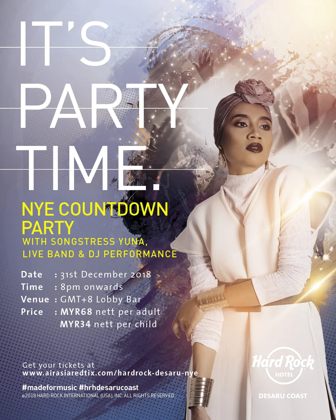 Celebrate New Year’s Eve with Malaysia’s very own international sensation Yuna at the brand new Hard Rock Hotel Desaru Coast on 31st December 2018 in a tropical glitz and glamour setting.