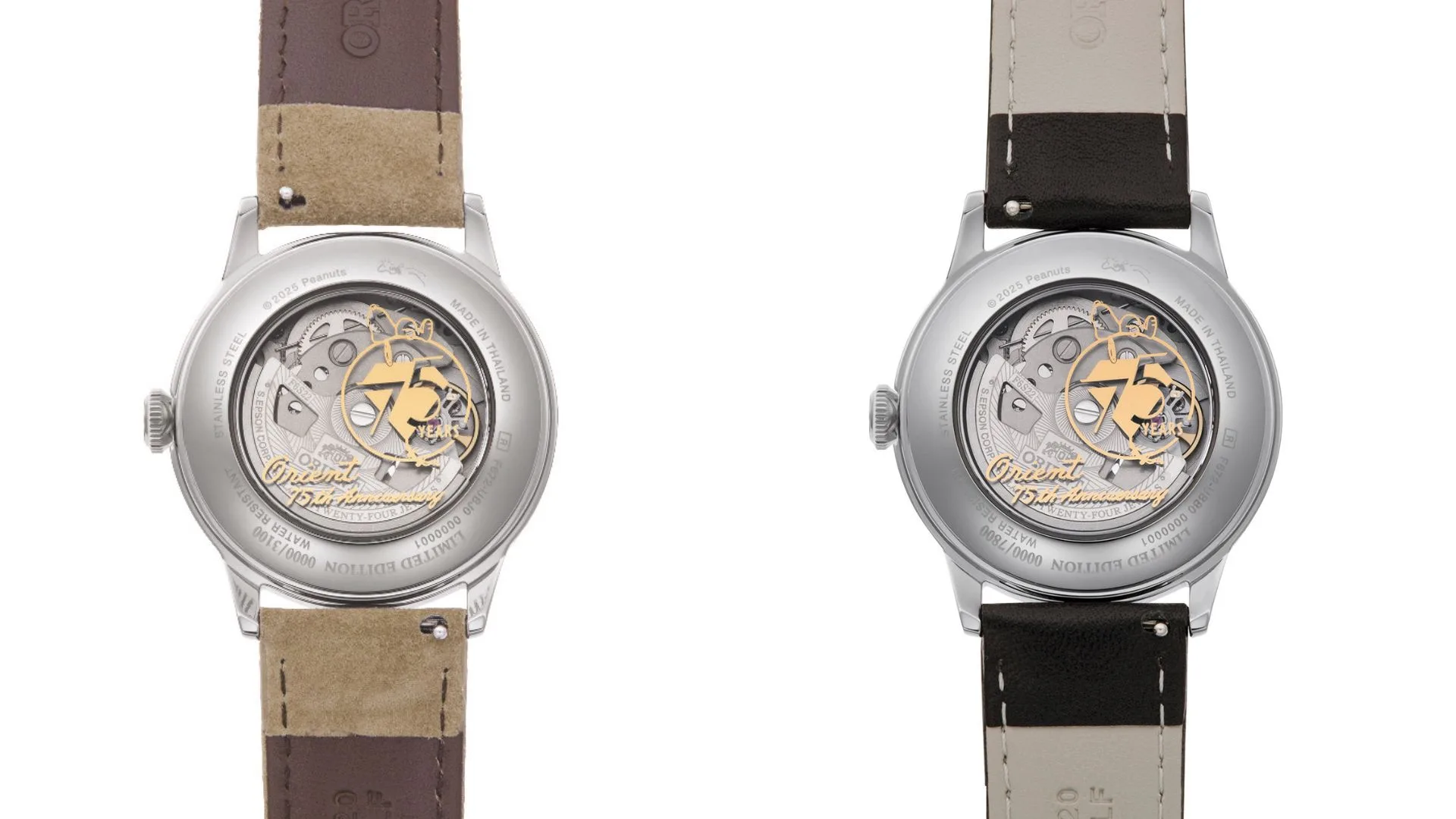 All models have a 40-hour power reserve and are powered with an automatic in-house calibre providing stable accuracy. The case back features the words “Orient 75th Anniversary” in cursive, the 75th anniversary Peanuts logo, and engravings of Woodstock and the limited-edition serial number.