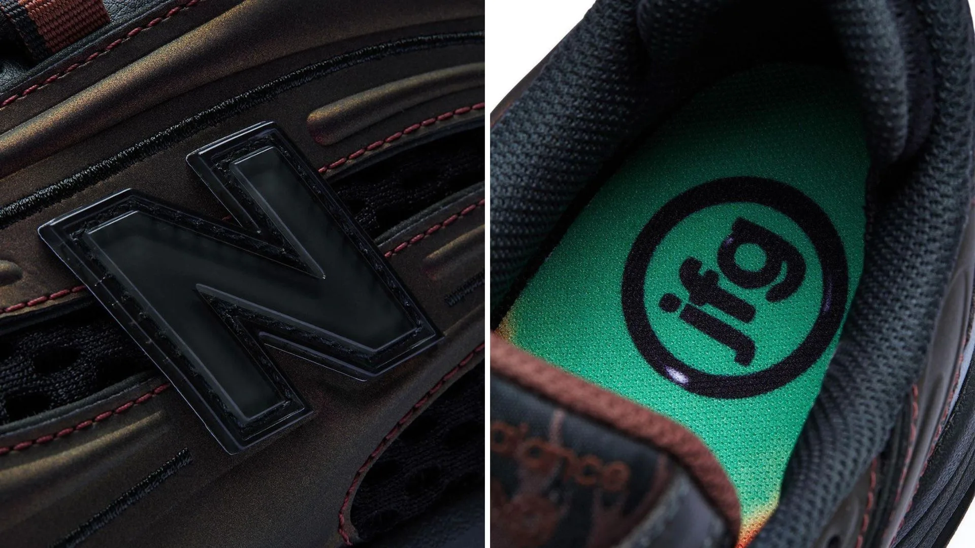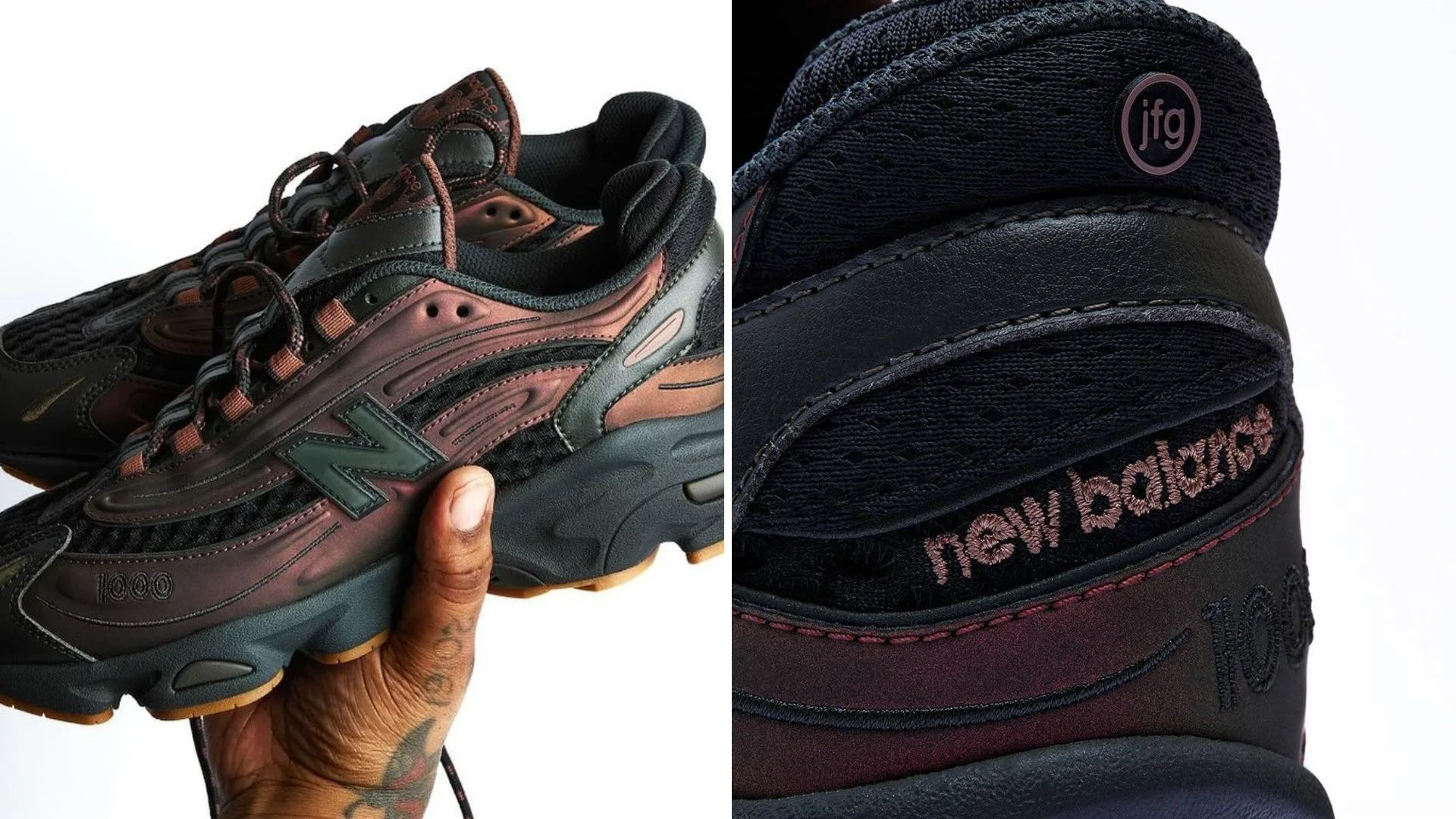 In honour of this collaboration, 1000 shoes are receiving a brand new colour scheme, a mix of black and grey shades that surrounds copper-tone iridescent overlays. There’s also a classic gum outsole plus a custom “jfg” hit surrounded by a circle on both the heel and the mint green insoles.