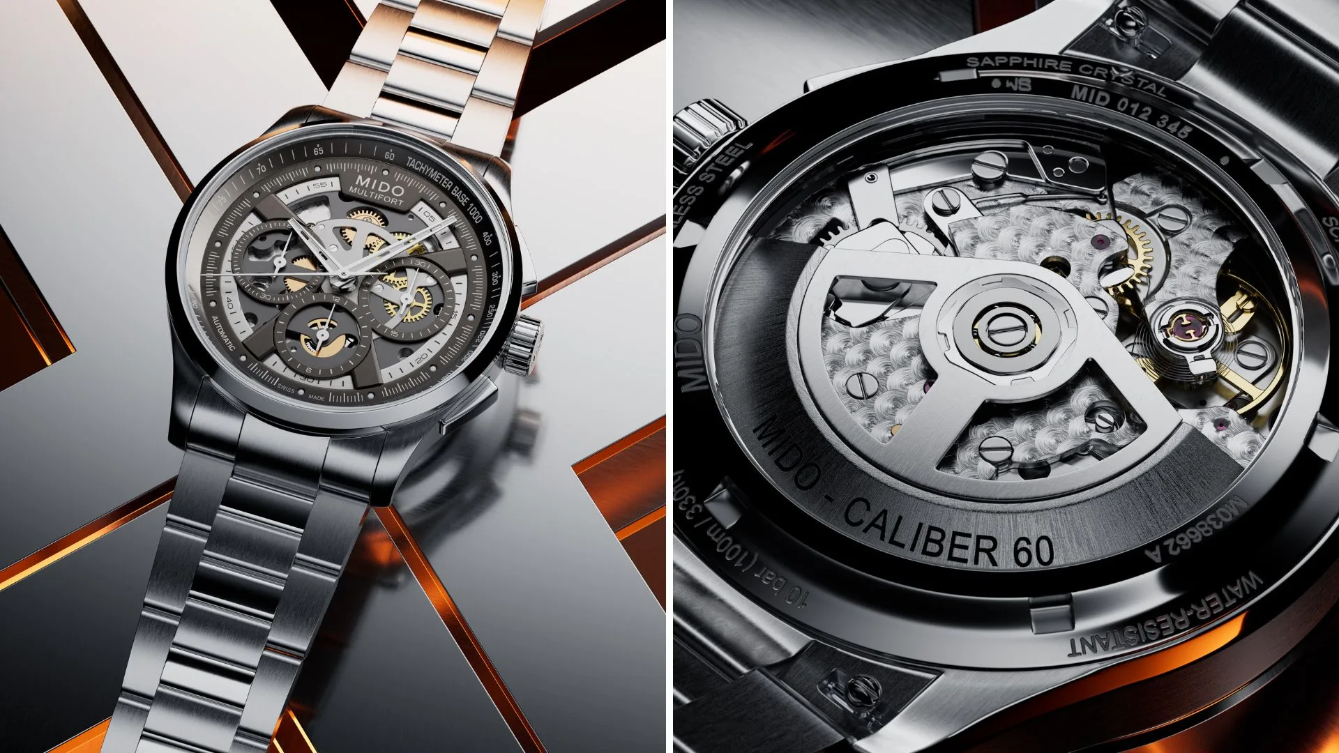 Inspired by the sleek aesthetics of supercars, the Multifort Skeleton Chronograph combines technical mastery with a bold design. The skeletonised Caliber 60 features meticulously crafted details, including circular-grained bridges and an oscillating weight engraved with the MIDO logo.
