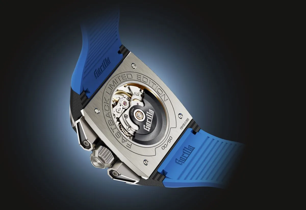 The limited-edition Gorilla Fastback Drift Mercury showcases a mesmerizing wandering hours complication by Vaucher Manufacture Fleurier set against a serene blue finish, creating a striking contrast with natural anodized elements and a robust Fastback case. To complete the look, it comes with a matching blue FKM hybrid strap, making the Fastback Drift Mercury an exclusive gem, limited to only 50 pieces worldwide.