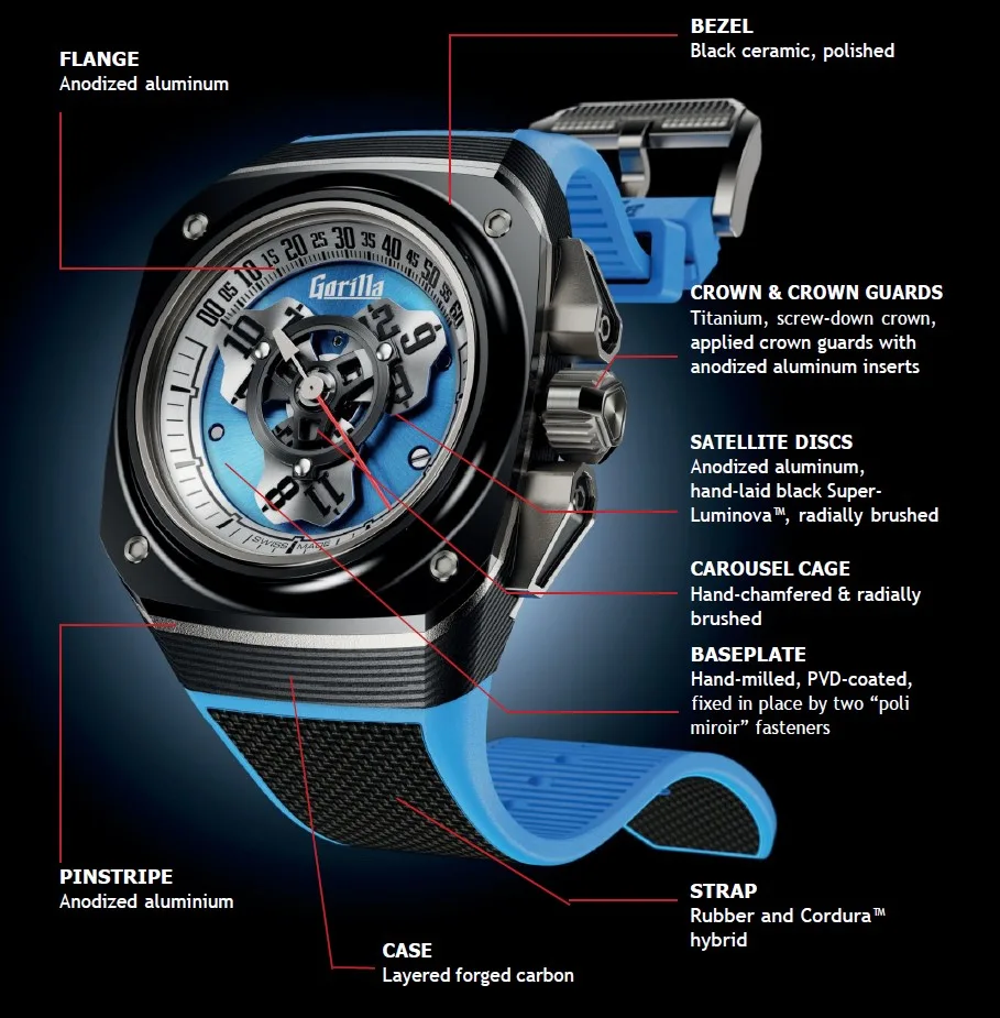 | CASE MATERIAL Forged carbon, anodized aluminum, titanium, ceramic | WATER RESISTANCE 100M/330FT/10ATM |