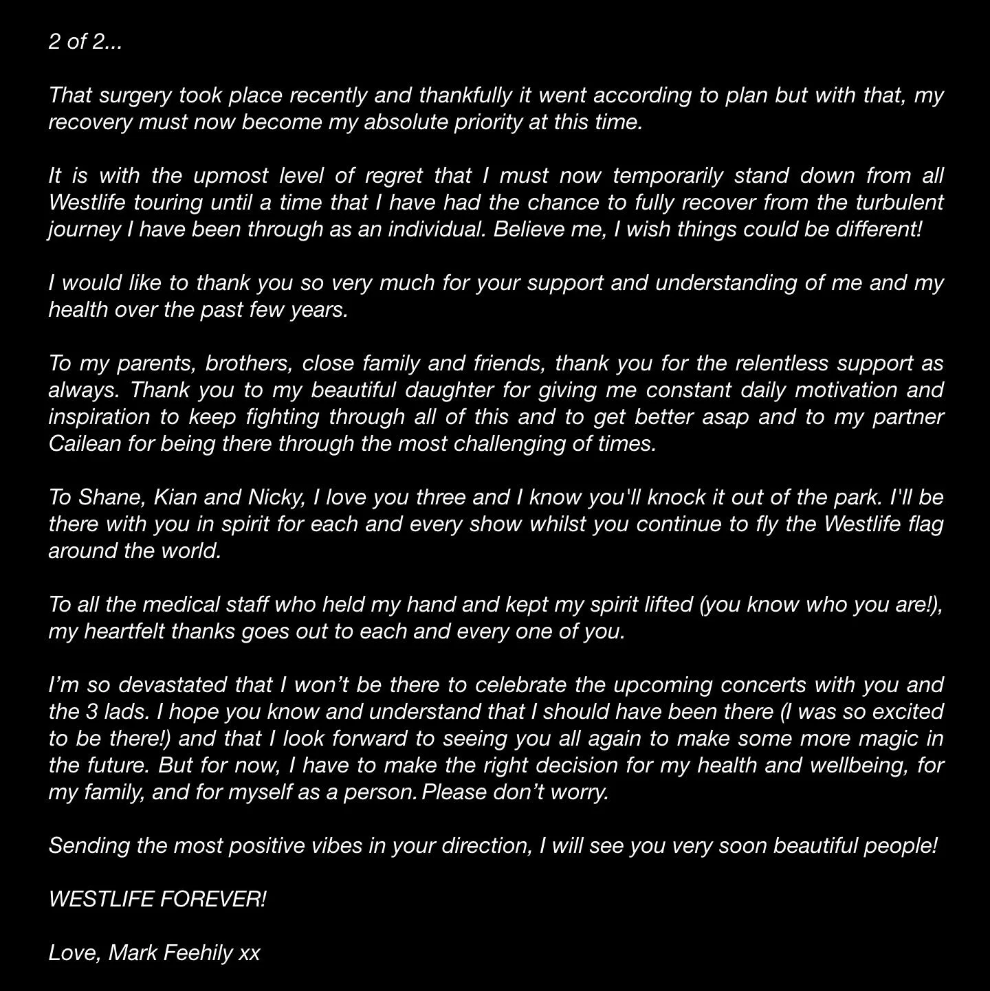 He added, “It is with the upmost level of regret that I must now temporarily stand down from all Westlife touring until a time that I have had the chance to fully recover from the turbulent journey I have been through as an individual.”