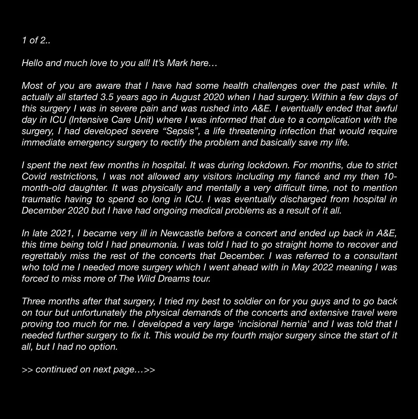 Less than 2 months ago, Mark Feehily released an official statement, explaining why he had to temporarily step down from all Westlife tours. “I developed a very large ‘incisional hernia’ and I was told that I needed further surgery to fix it. This would be my fourth major surgery since the start of it all, but I had no option,” the 43-year-old singer said.