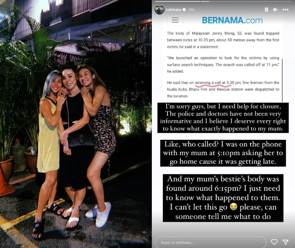 Yesterday (Tuesday, 27th June), Talitha Tan posted a screenshot of a news article on her Instagram story. From the screenshot, she highlighted the part where it was written that authorities received a call at around 5:30pm regarding the tragic incident. The musician claimed that she’s being kept in the dark about what actually happened to her mother and her friend.