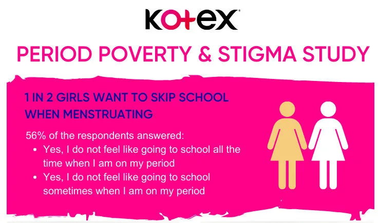 According to the findings of the first Kotex Period Poverty and Stigma study, more than one in two females wanted to miss school when they were on their periods. This suggests that periods continue to be a mental barrier in how a girl views herself and her motivation to participate in school and daily activities in this day and age.