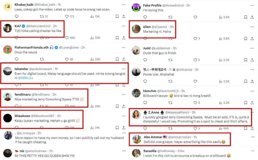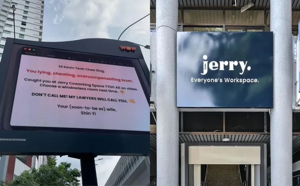 However, many noticed something peculiar about the billboard – specifically, the place name-dropped by the scorned wife. This revelation led many to believe the public shaming billboard was an advertisement for Jerry Coworking Space, which has multiple locations in Klang Valley. The coworking space is known for its many marketing campaigns and many said this was another unconventional yet brilliant move by the team to get more eyes on their business and advertise their services.