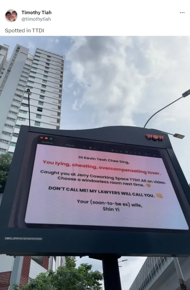 The billboard wrote, “Hi Kevin Teoh Chee Sing, you lying, cheating, overcompensating loser. Caught you at Jerry Coworking Space in TTDI! All on video. Choose a windowless room next time. Don’t call me. My lawyers will call you. Your (soon-to-be) wife, Shin Yi.”