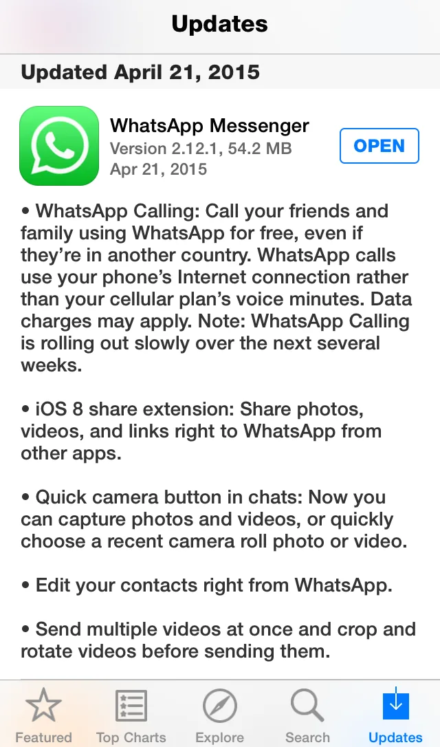 Now, we spy that the feature is starting to roll out to iOS users! We know this because an update to the iOS app hit the iTunes Store less than a day ago, indicating that you too will soon be able to call just about anyone using WhatsApp for free, regardless of where they are in the world. Of course, like most modern-day voice-calling features, it uses your internet connection (read: data) to complete these calls.