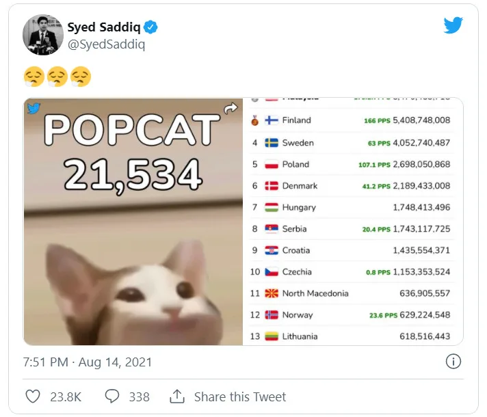 POPCAT has also gained the attention of the MP of Muar, YB Syed Saddiq Syed Abdul Rahman — resulting in him being amazed by Malaysia’s efforts in securing the first rank. His tweet displayed three “face exhaling” emojis and one of his followers even replying to his post with her cat playing the game.