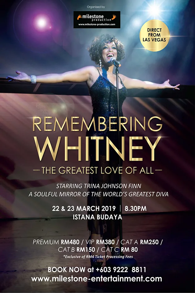 “Remembering Whitney – The Greatest Love of All” live concert is presented by Milestone Productions Sdn Bhd. The show will take to stage for 2 nights on 22nd and 23rd March 2019 at Istana Budaya in Kuala Lumpur.