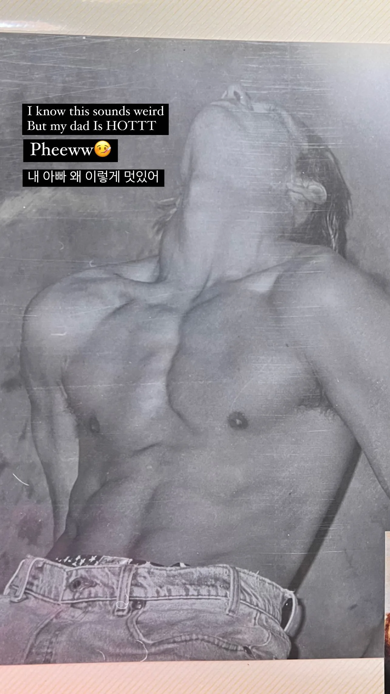 Yesterday, the former I.O.I member took to her Instagram Story to share a black-and-white photo of a sexy man without his shirt on. He is seen leaning his neck back, showing off his chiseled abs. Turns out, the hot guy in the photo is actually Somi’s father, Matthew Douma!
