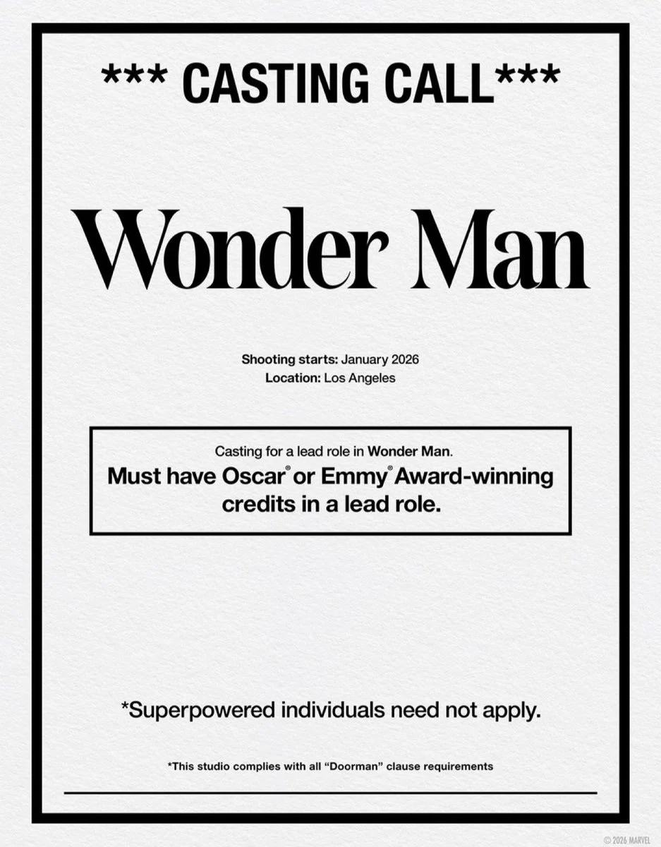 “Wonder Man” introduces the “Doorman Clause,” a fictional policy that outright bans superpowered individuals from working as actors. According to Marvel’s in-universe promotional materials, performers must now certify that they possess no superpowers before stepping on set. It’s a rule plastered across mock magazine covers declaring, “Hollywood Bans All Superpowers.”