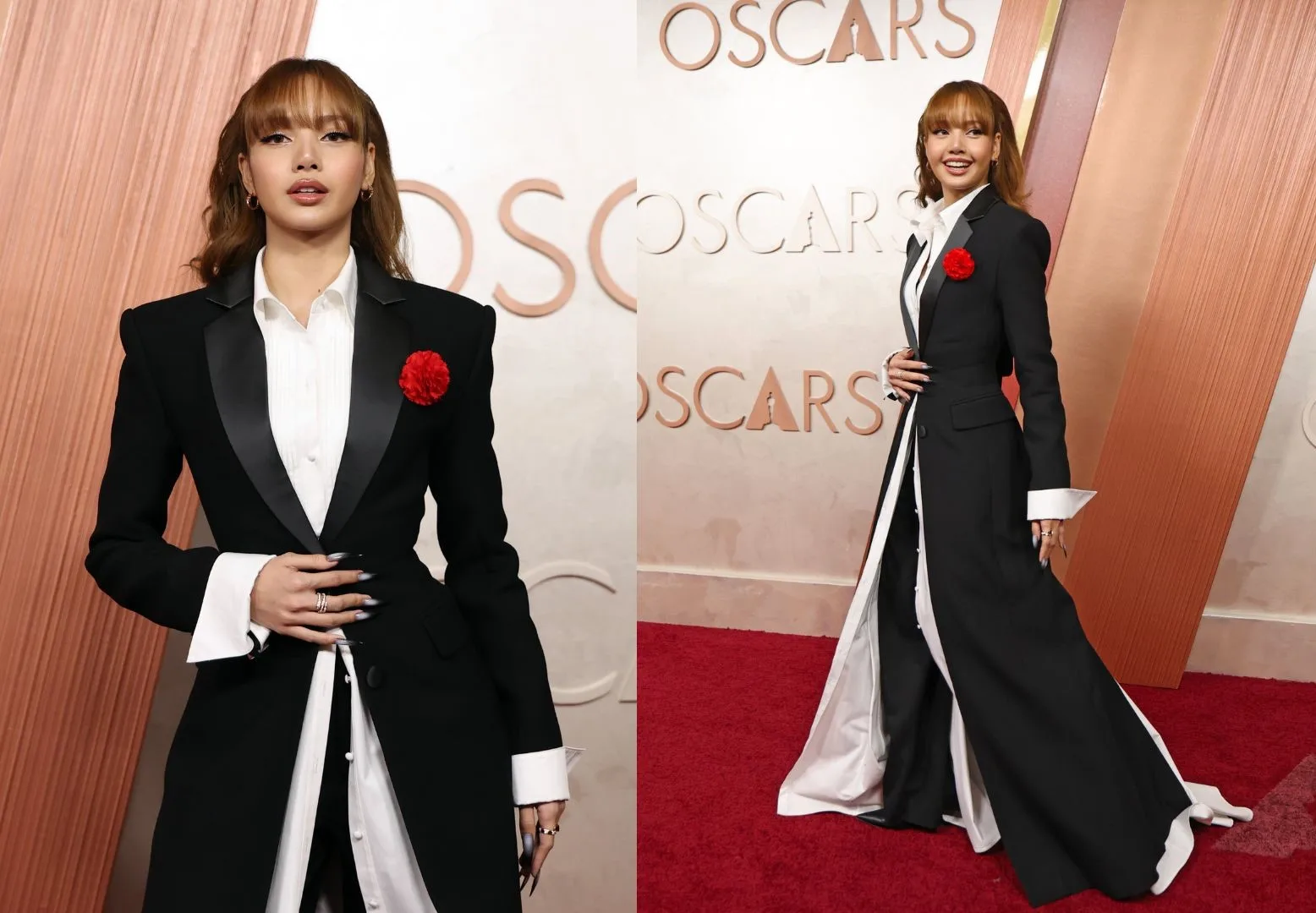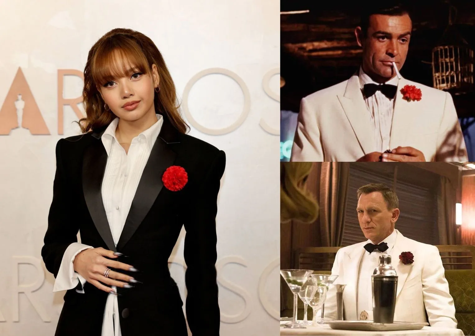 At the 2025 Oscars, BLACKPINK’s Lisa made a striking entrance that paid homage to the iconic James Bond. Instead of wearing traditional gowns, she opted for a sharply tailored black tuxedo ensemble by designer Mark Gong. The outfit featured a sleek black tuxedo blazer paired with wide-leg trousers, exuding sophistication and confidence. Adding a pop of colour, Lisa accessorised with a vibrant red floral brooch pinned to her lapel in reference to the legend Agent 007.