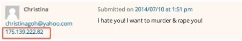 With the same IP address, she then changed her name to “Christina” and sent her a rather disturbing death threat.