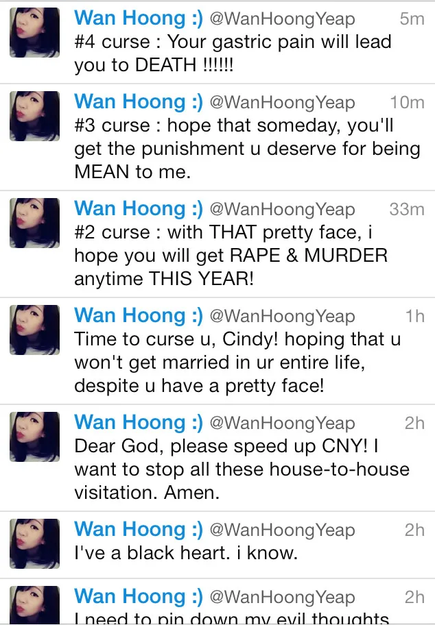 After Cindy deleted her from her Facebook account, #WHY posted a series of hateful tweets towards Cindy. On top of that, she even went around asking random people about Cindy and eventually called her at her office one day.