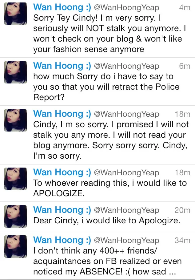 As it turns out, the stalker found out the police report as well and posted a series of tweets again to apologise: