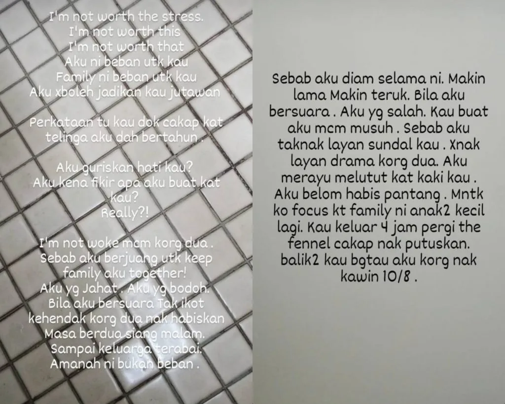 “I pleaded and kneeled at your feet. I haven’t finished my confinement period, so please, focus on this family. Our kids are still small. You went out to The Fennel for 4 hours, claiming that you wanted to break up your relationship. But in the end, you informed that you guys are getting married on 10th August,” the woman wrote.