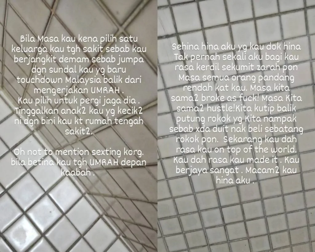 She then revealed, “There was this one time, the whole family was sick because we were infected by you, who carried the fever because you met your bitch, who just came back from performing umrah, but you chose to go and take care of her instead. You left your ailing wife and kids at home. Oh, and not to mention, you guys were sexting while she was in front of the Kaabah.”