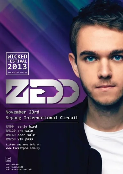 Zedd was first discovered by Skrillex in 2009 and along the way, he has produced tracks for Lady Gaga, Black Eyed Peas, P. Diddy, Swedish House Mafia, Skrillex, Eva Simmons and was awarded Billboard #1 dance track of 2012. Having played at major festivals such as Tomorrowland, Stereosonic, Lollapalooza and Ultra amongst many, Zedd will be making his way to Malaysia this November for the first ever Wicked Festival.