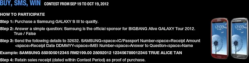 From 19th September 2012 to 19th October 2012, Samsung Malaysia is giving you the opportunity to win exclusive VIP concert tickets to BIGBANG’s concert in Malaysia, Limited Edition BIGBANG GALAXY S III Back Covers, BIGBANG Exclusive Box Sets (BIGBANG CD Album, Limited Edition BIGBANG GALAXY S III Back Cover, BIGBANG T-Shirt), and a whole lot more.