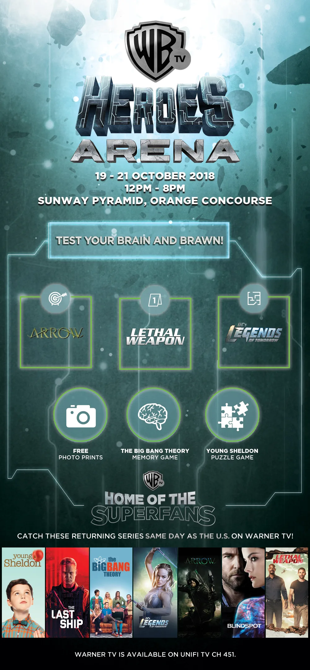 Designed to test your superfan knowledge, you can find out if you are just as good as your favourite Warner TV (UniFi TV Ch. 451) heroes at the Warner TV Heroes Arena this weekend! In the arena you will need to put on your thinking cap like Sheldon Cooper from “The Big Bang Theory”, join the Legends on a journey into the galaxy to retrieve lost valuables and investigate a murder crime scene alongside “Lethal Weapon”’s crime-busting duo.
