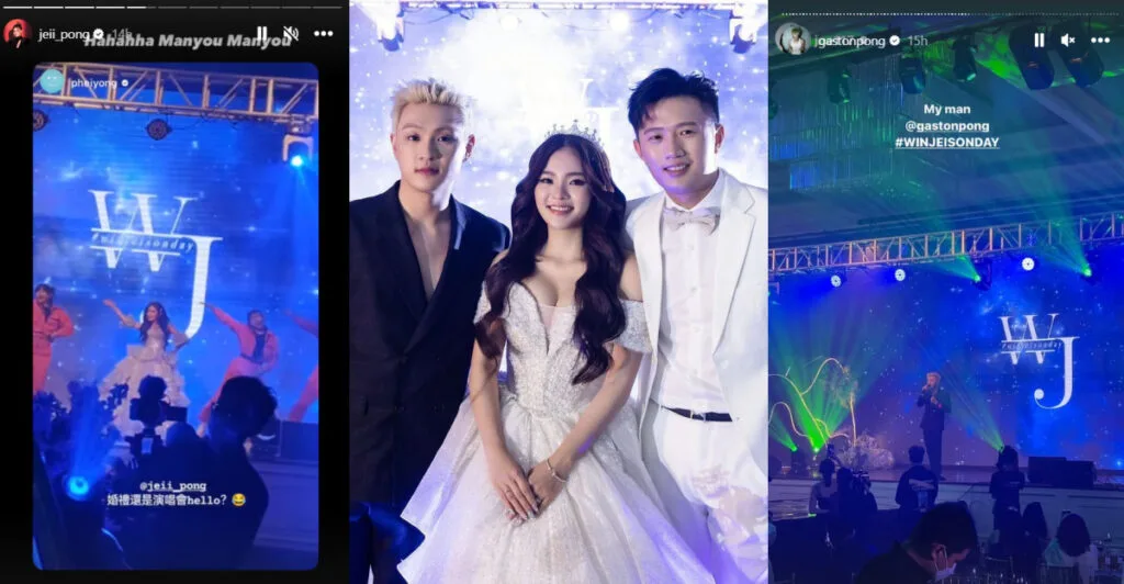 The couple’s banquet was certainly a lively one with plenty of performances from fellow friends. Jeii’s beloved brother and local singer Gaston Pong also sang at his sister’s wedding dinner, which delighted many. Jeii herself too took to the stage to perform her new song “Manyou” live for her guests. This later garnered teasing from friends, with several claiming she was a “very hardworking bride”.