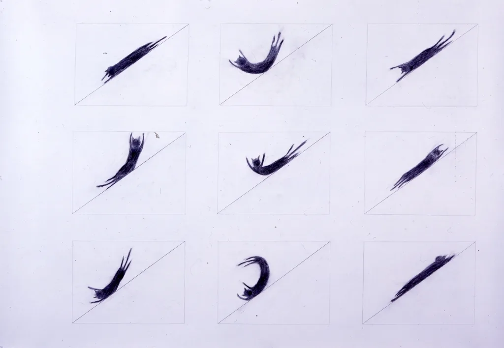 The theme of impermanence is once again manifest in Taro Izumi’s “Curos Cave”. The video sees the Nara native perform live drawings on a television monitor. As the images change, he erases his attempts and starts new ones, giving an abstract quality to the mess created on-screen.