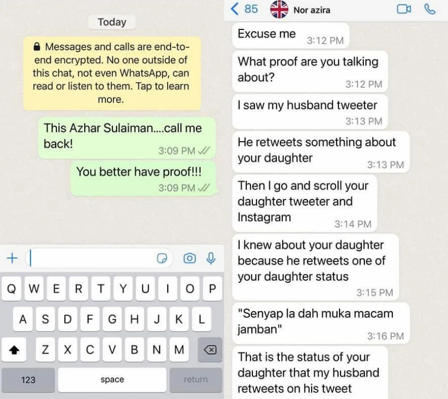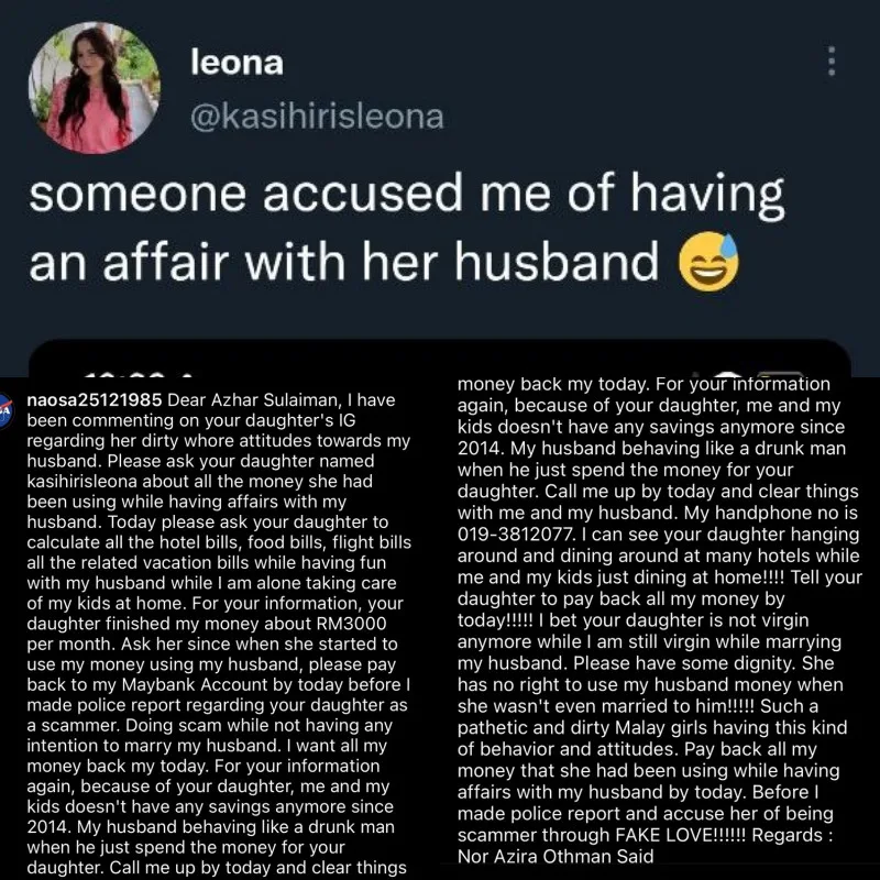 Kasih Iris Leona, daughter of veteran actor Azhar Sulaiman, tweeted a screenshot of an IG comment yesterday (Sunday, 14th August) where this woman was accusing her of having an affair with her husband. The woman known as Nor Azira commented on her father’s Instagram detailing about the alleged affair and demand that she gets her husband’s money back.