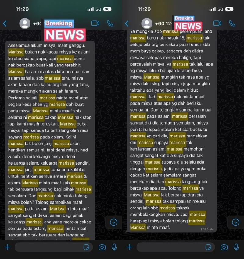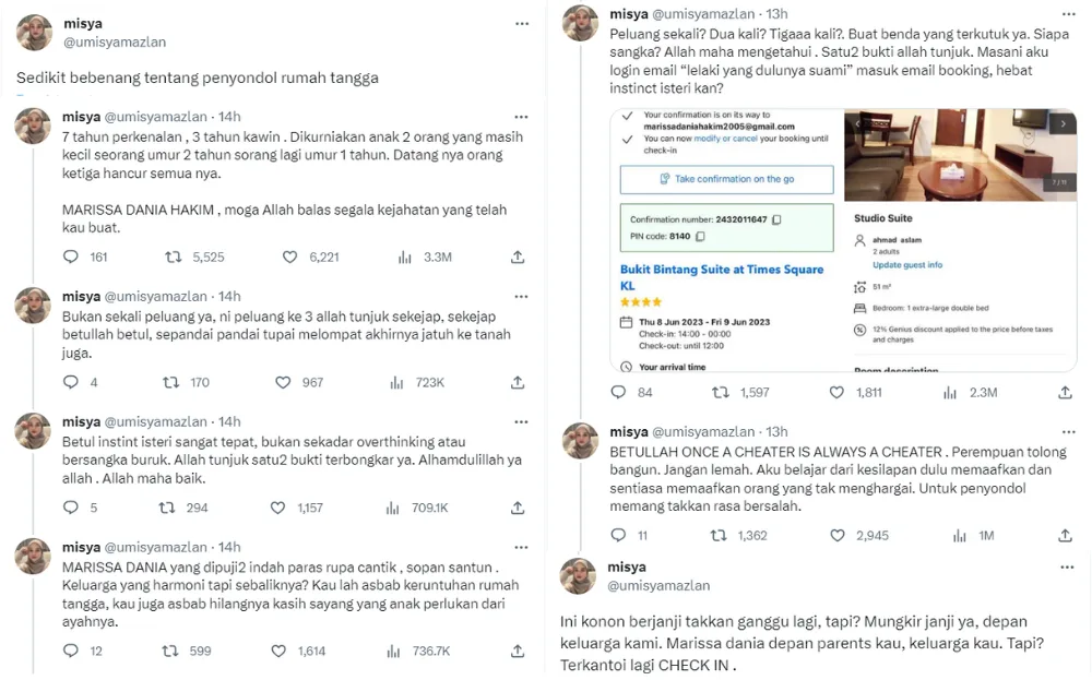 According to Misya, the affair has been going on for a long time, adding that her instinct led to her uncovering evidence. In her thread, the woman shared that her ex-husband and Marissa had checked into a hotel, even providing the hotel booking receipt. She also shared a screenshot of a message from an unknown number, hinted to be Marissa, apologising for the affair.