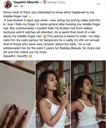 Refusing to stay silent about the naysayers’ comments about her nails (particularly her middle finger nail), the FB user clarified that it was broken a few days ago when she was doing her juicing video. For those interested, read her full explanation here: