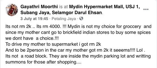 The shopper took to her Facebook to vent her frustration about the situation. According to her post, she had to drive her mom to the Mydin mart to buy some Indian spices, as she is no longer able to travel all the way to Brickfields.