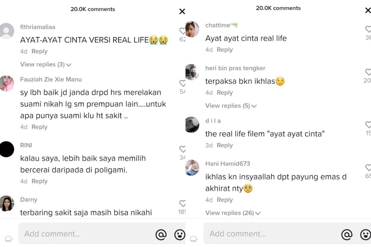 The plot of the story however, arouses suspicion. The video that was posted on TikTok user @Rumah Pelangi account had managed to acquire sympathy from netizens. Many commented on the fact that the situation resembles the storyline of a famous Indonesian love story “Verses of Love” (Ayat-Ayat Cinta) written by Indonesian writer Habiburrahman El Shirazy.