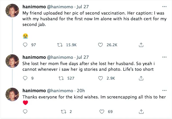 One of the stories was shared by Twitter user @hanimomo a few days ago. In the caption, she shared how her friend lost her husband and her mother in a short period of time.