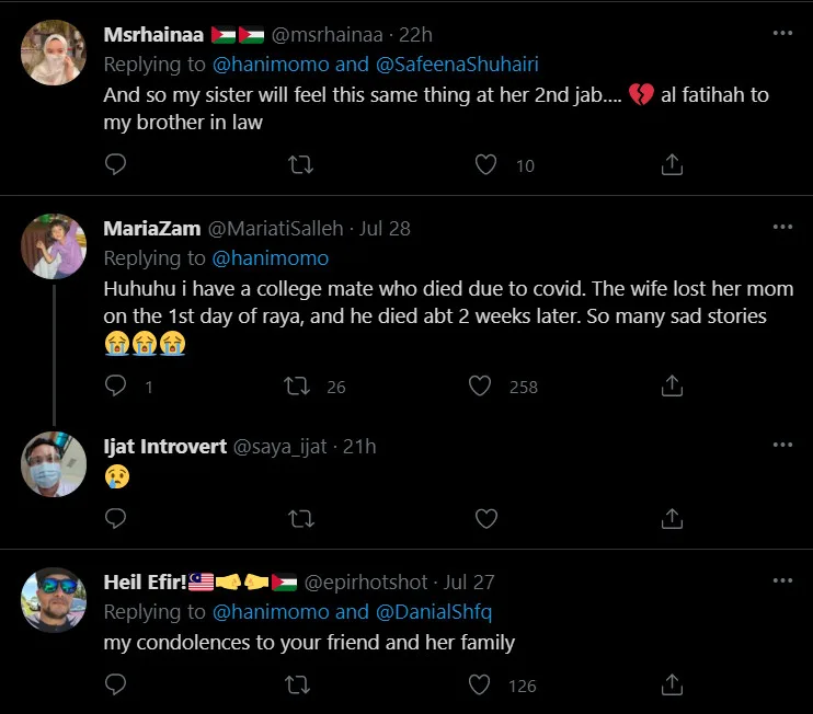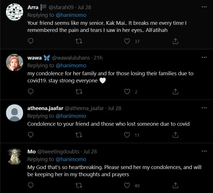 The tweet has garnered netizens support and many sympathise with her story and expressed their condolences. Under her post, some netizens also shared their experiences dealing with the same situation. “I have a college mate who died due to Covid-19. The wife lost her mom on the 1st day of Raya, and he died about two weeks later. So many sad stories,” remarked one netizen.