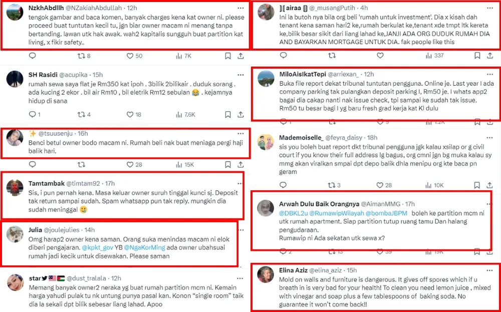 The tweets attracted attention from netizens, who shared their reactions to the issue. Many sympathised with Nisa, sharing their similar experiences dealing with terrible landlords. Many netizens also urged her to lodge a report against Nadia, noting that she violated laws like partitioning the rental unit and endangering the tenant’s health by allowing mould to grow in the unit.