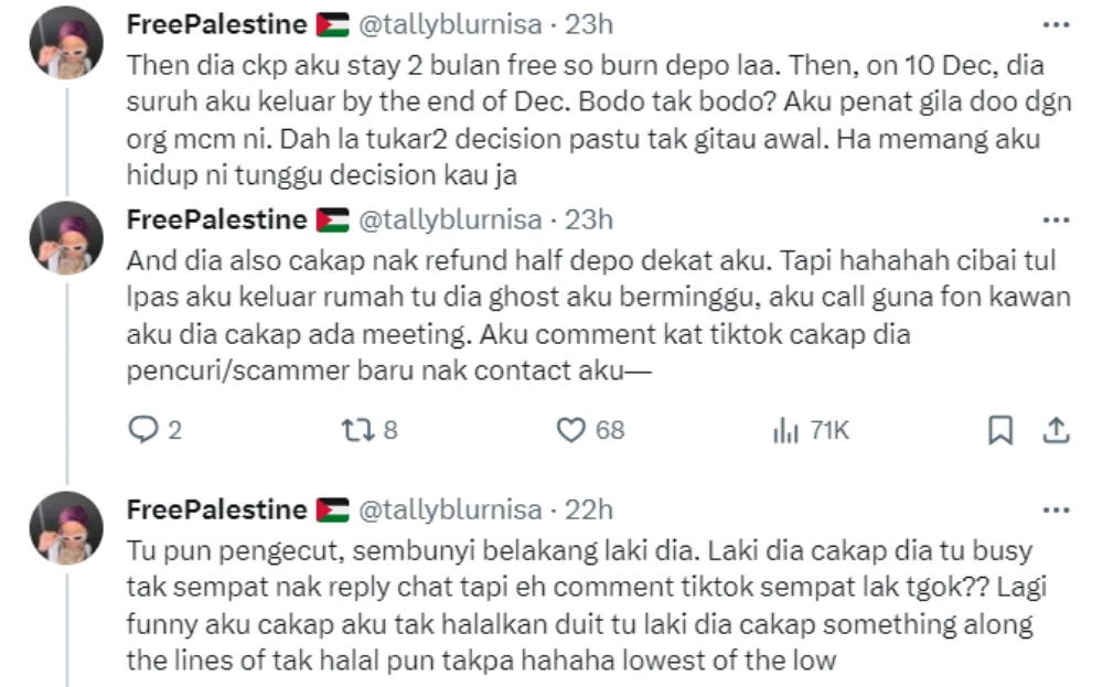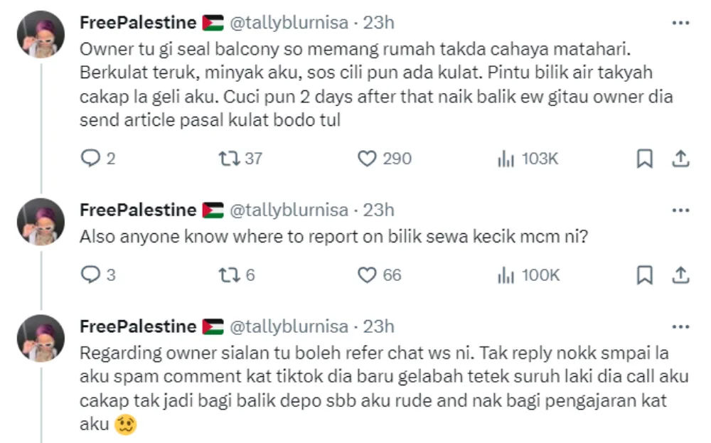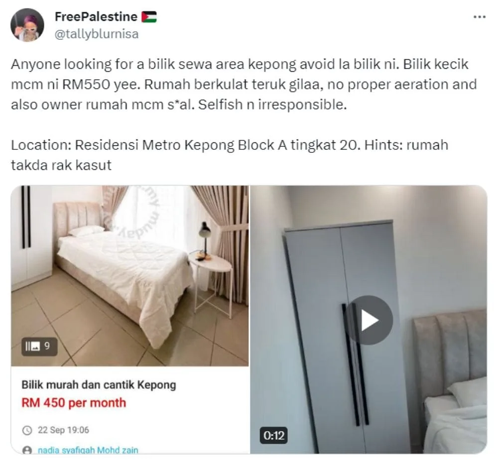 Before renting an apartment or a room, it’s good practice to look up more information about the place and the landlord to know what you’re getting from the deal. Twitter user @/tallyblurnisa recently shared her terrible experience with her former landlord of a Kepong apartment, hoping that no one else would go through what she did.