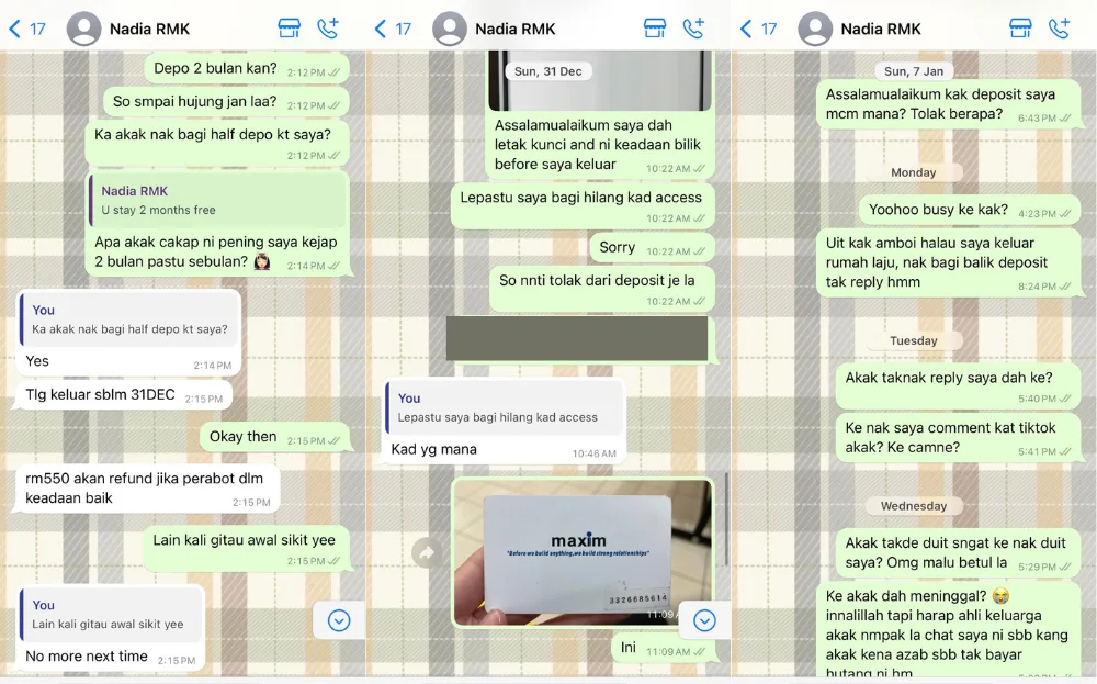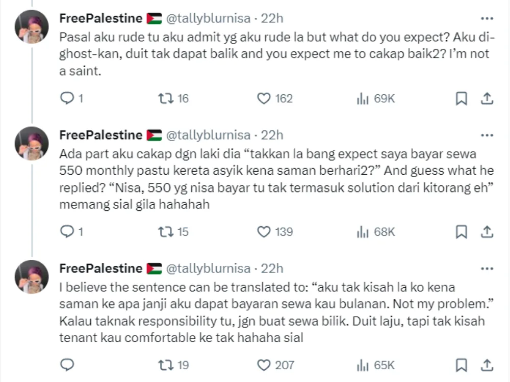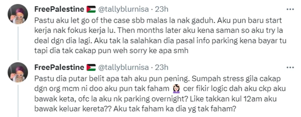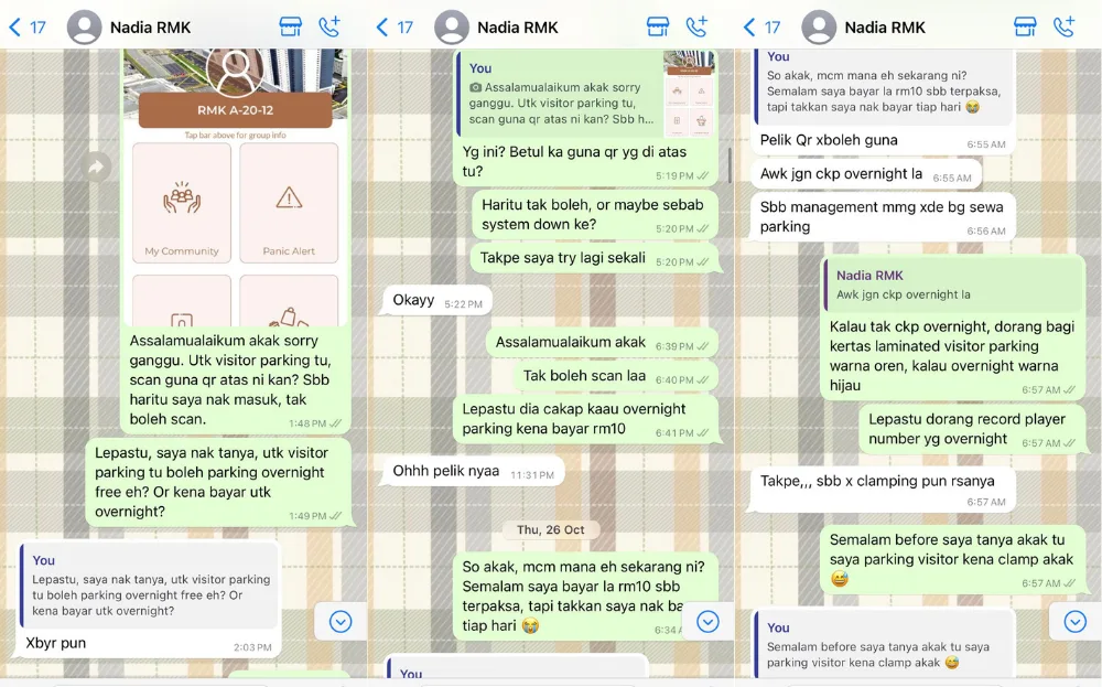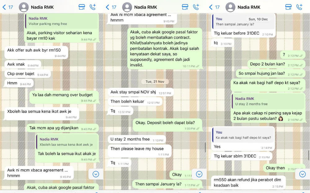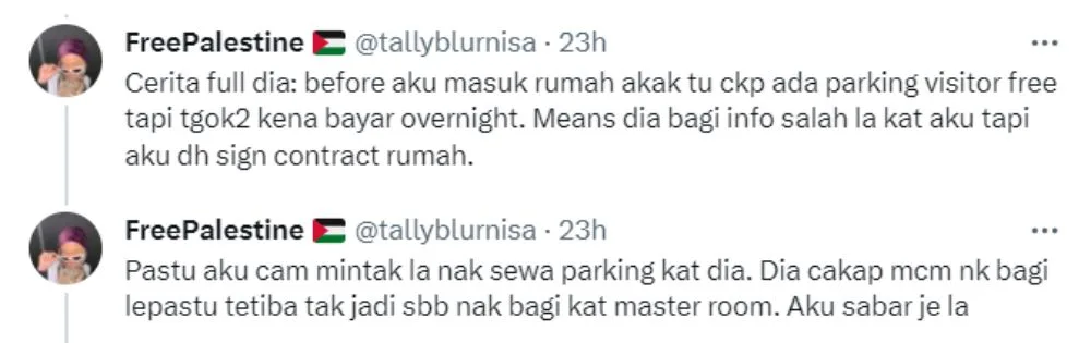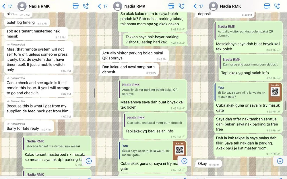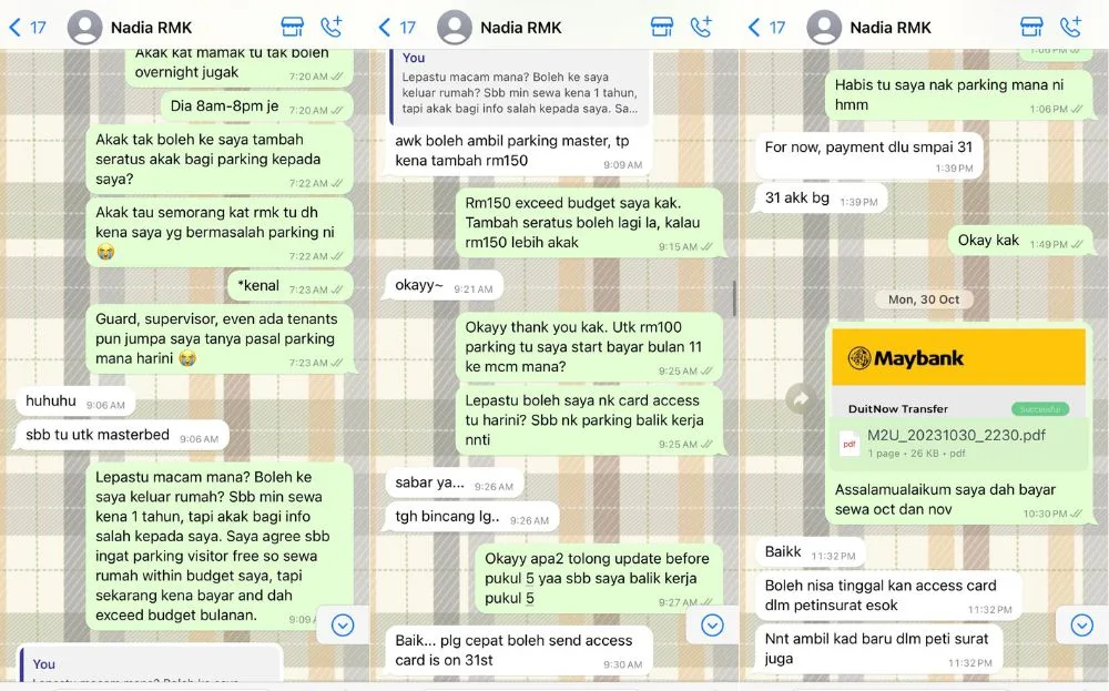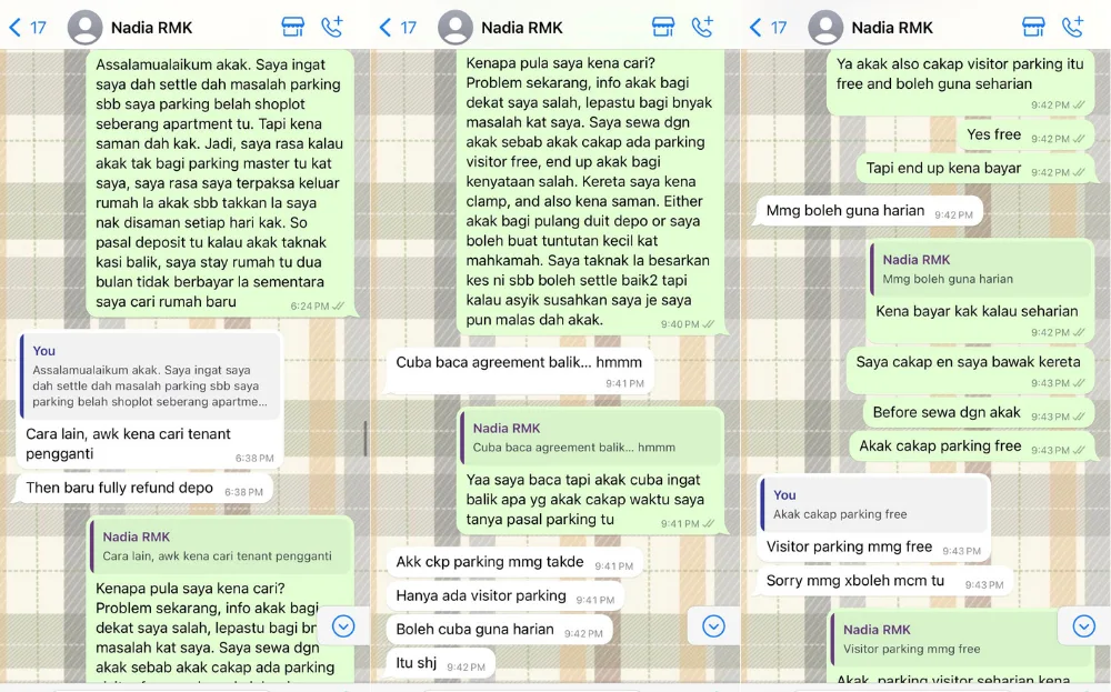In the Twitter thread, Nisa shared multiple screenshots of her conversation with homeowner Nadia, lamenting her lack of responsibility towards her tenants. Nisa revealed that the issue started with the parking system and the rental agreement. She said that she had agreed to rent a room as Nadia promised there would be free parking at the building, but it turns out, there is a daily fee as the free parking is only available for those who rent the master bedroom.