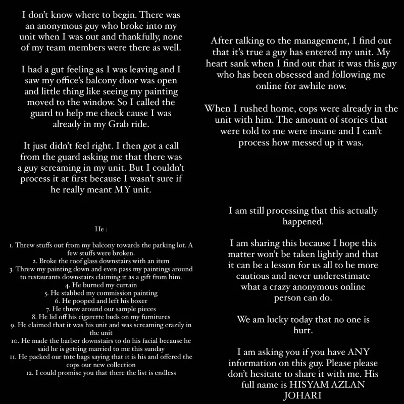 Syaira revealed that her stalker had threw her belongings out the window, burned her curtains, stabbed her commission painting, pooped and left his boxers in her bathroom, claimed that the unit was his and started screaming, and made the barber downstairs do his facial after claiming that he was going to marry her soon. She claimed that he had done much more than the things she had listed down.