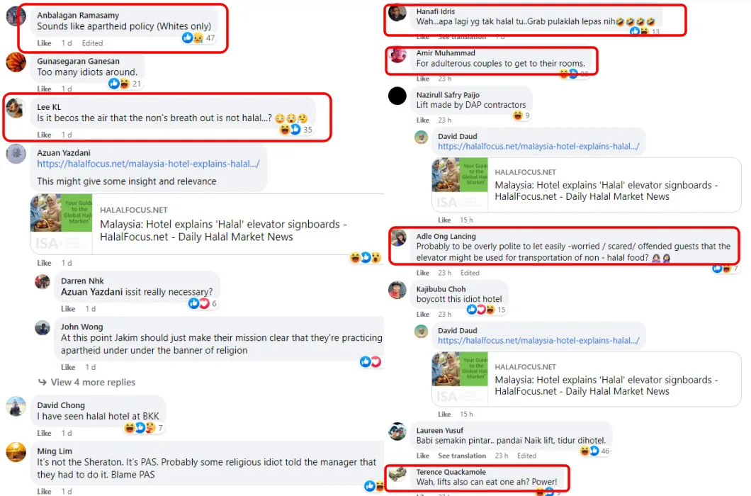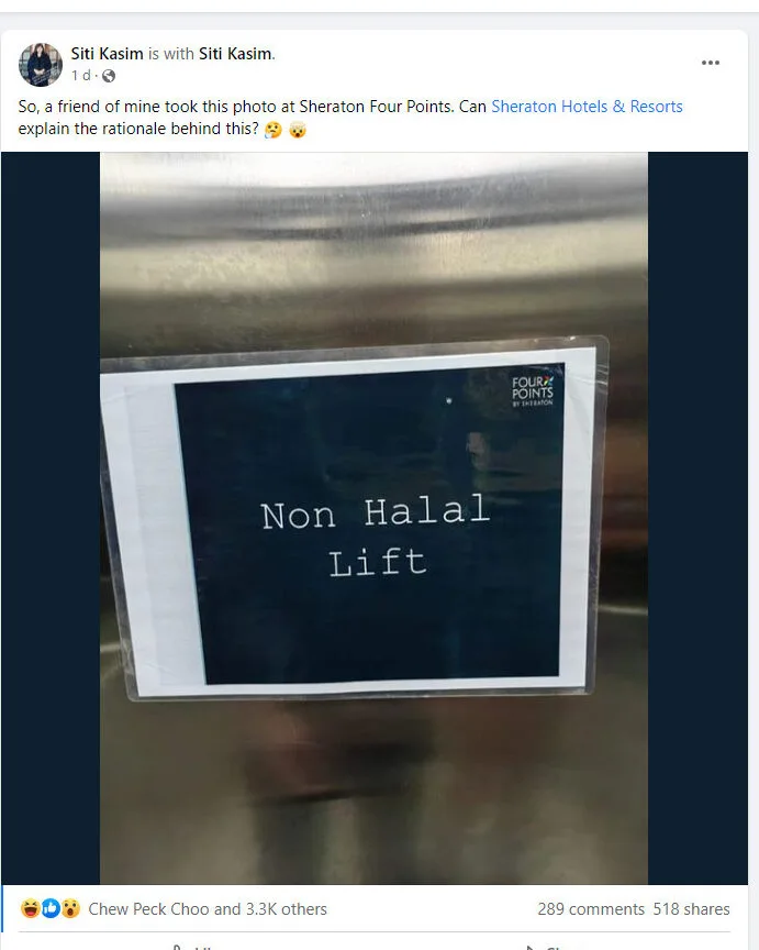 The post has in turn been flooded with tons of comments left by netizens on social media. It left many wondering about the logic behind the non-halal notice on the lift. “Is it because of the air that the (non-halal people) breath out?” one netizen questioned. Additionally, another FB user also quipped that the lift is specially made for “adulterous couples to get to their rooms.”