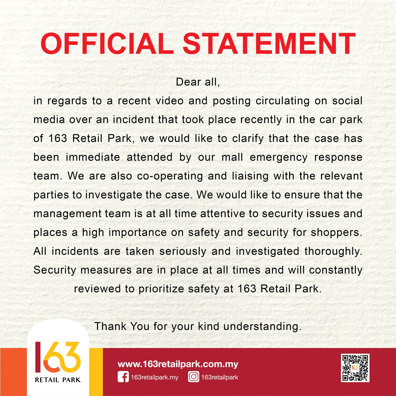 Ever since this video has been circulated around social media, 163 Retail Park released an official statement through their Facebook page. Referring back to the video, they have stated how “All incidents are taken seriously and investigated thoroughly.” And we sure hope they do! We hope both the woman from the management team along with the harasser are held responsible.