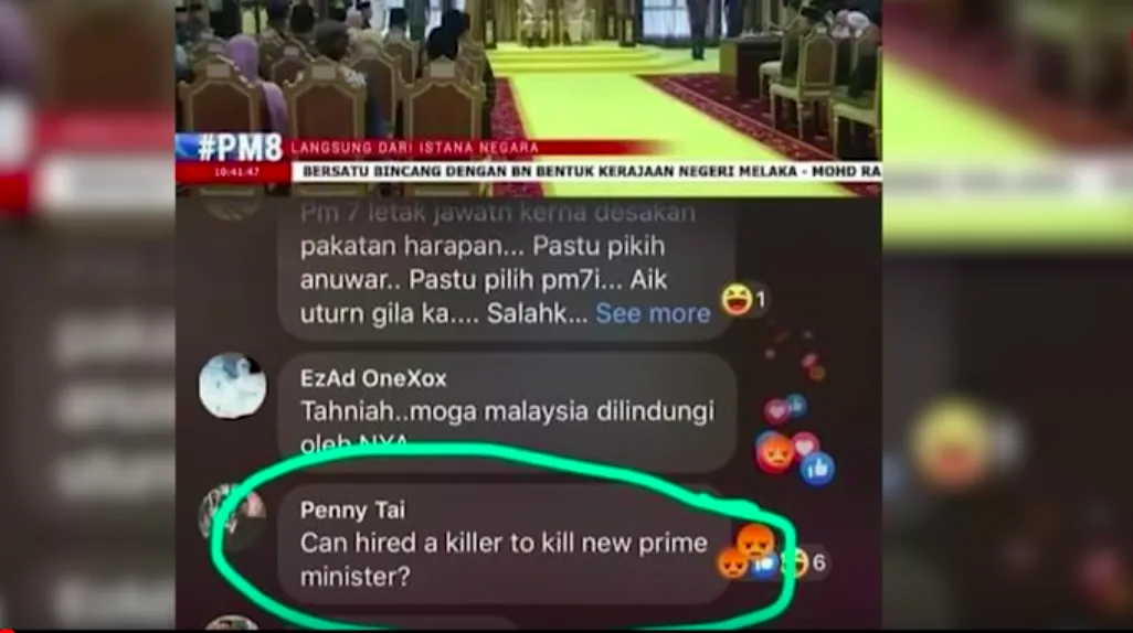 Penny is currently being investigated under the Penal Code Section 506 (the offence of criminal intimidation) and Section 233 of the Communications and Multimedia Act (CMA) 1998 (threatened national security through the use of Internet). If found guilty, she could be put behind bars or faced with a fine up to RM50k.