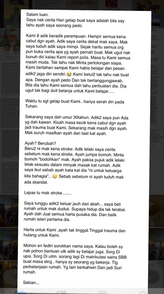 Through the posting shared by Fedtri on his social media earlier on Monday (4th October), the lady revealed that she and her sisters had almost been molested by their own dad. To make things worse, even their mother didn’t seem to believe the allegation made against her husband!