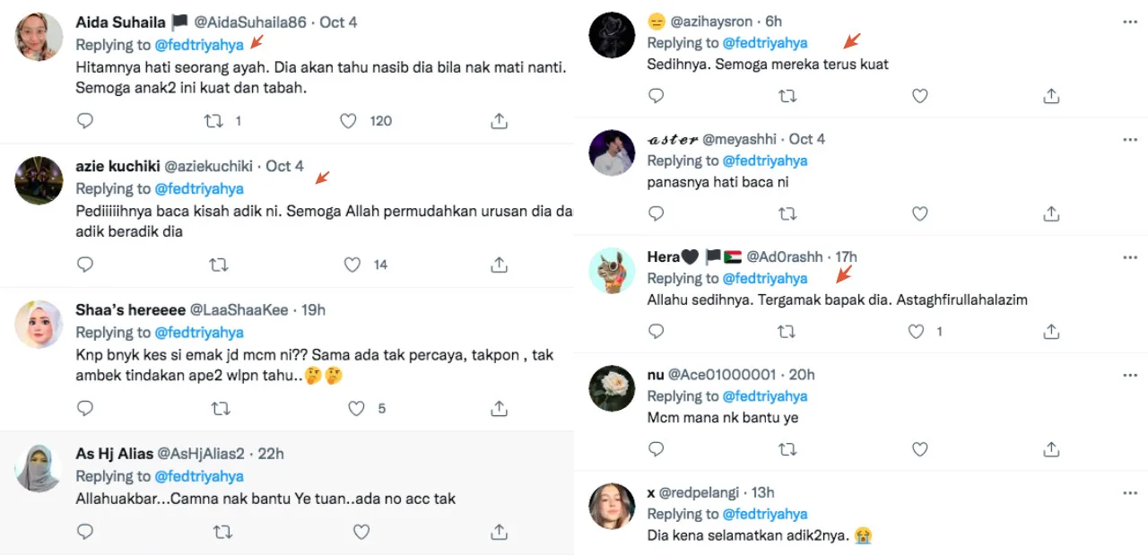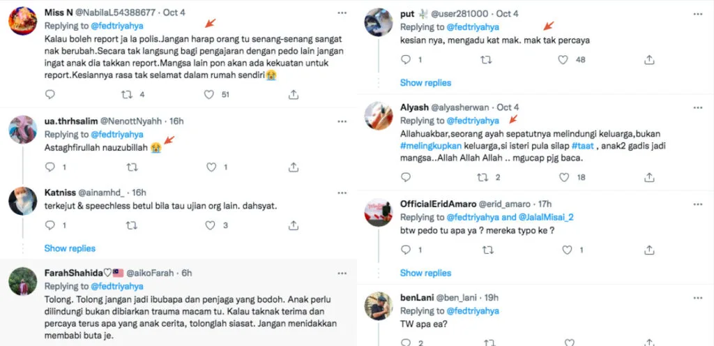 Fedtri’s tweet has since gone viral on social media, with over 1.4k retweets at the time of writing (Tuesday, 5th October). Most of them were deeply saddened by the traumatising incident. Others also called for the girls to file a police report against their paedophile father.