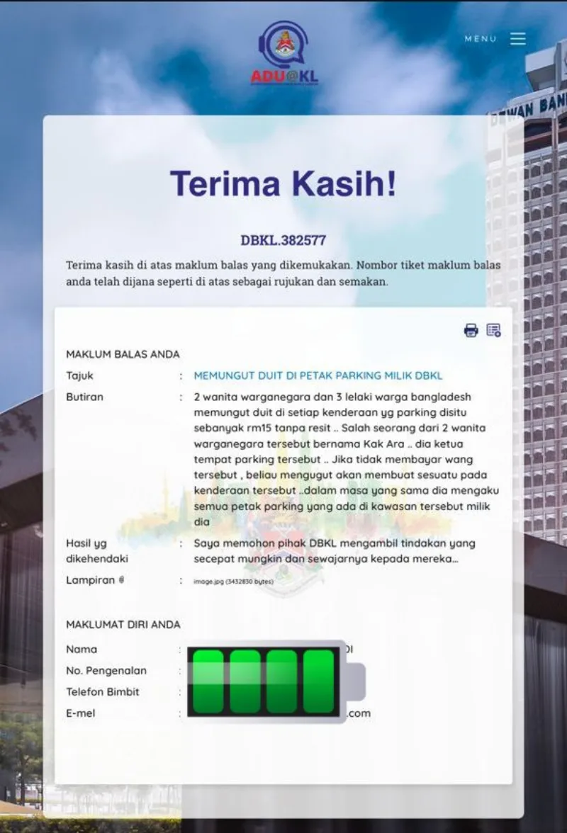 Thankfully, @ballerina391 took netizens’ advice and filed a complaint to the Kuala Lumpur City Hall (DBKL) regarding the incident. In her report, she wrote that 2 local women and 3 foreign men had been threatening people in the area to pay them to park. The leader of the group, known as Kak Ara, claimed that the parking spaces belonged to her and that she’d do something to people’s cars if they refused to pay her money to park.